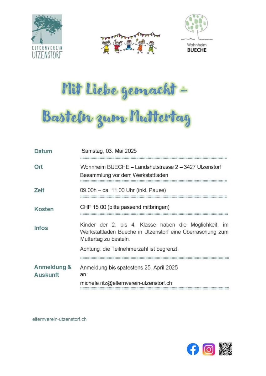 Kinder ab dem grossen Kindergarten sind herzlich eingeladen in Begleitung einer erwachsenen Person (keine Mamis) für ihr Mami zu backen.